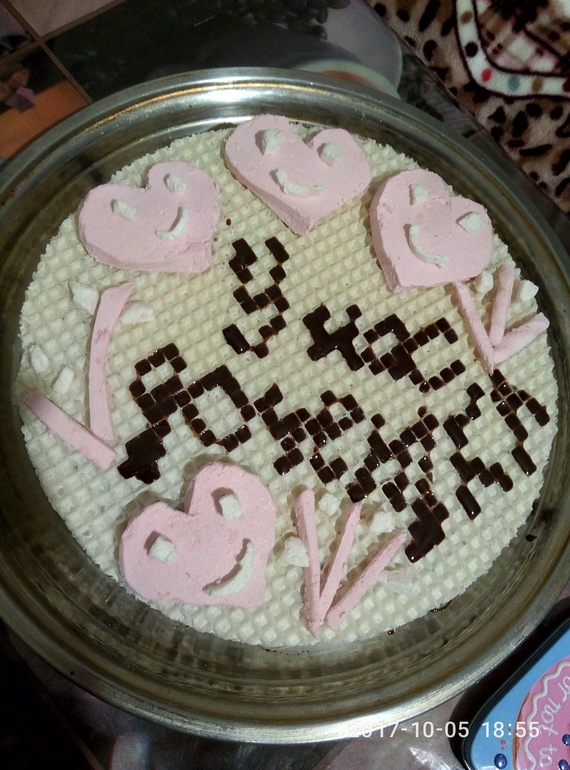Пол малышапошла на внеплановое узи,т.к. паникер еще тот. 16 недель.все хорошо.и показали нашу "булочку":).я там плакала от счастья.и что с малышкой все хорошо,и что у меня ни тонуса,ни вопросов с шейкой,ну и что девонька у меня.я очень хотела дочурку. папа наш еще не знает.у него в последний момент не получилось со мной пойти на узи. вот мой экспромт с сюрпризом для папы. кондитер с меня еще тот,хотела что-то своими руками сделать. сердечки из зефира:)ха-ха,похоже на колбасу.хотя папа и колбасному торту был бы рад.теперь ждем папика с работы