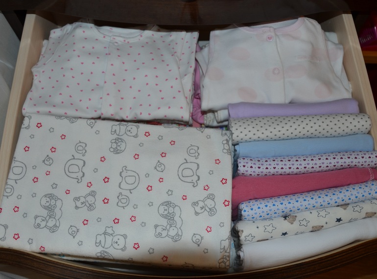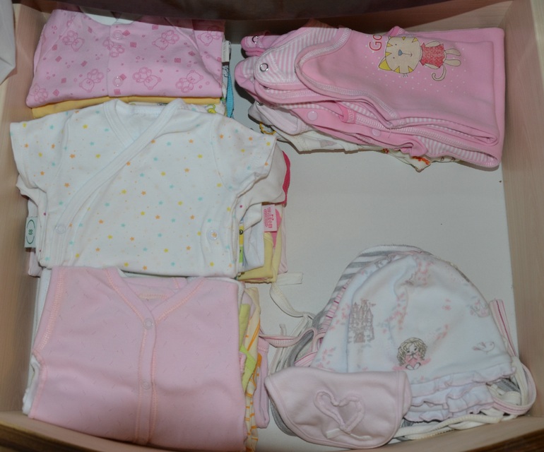 Нижний ящик заполнится теплыми слипами и костюмами, носочками, тоже в процессе наполнения.