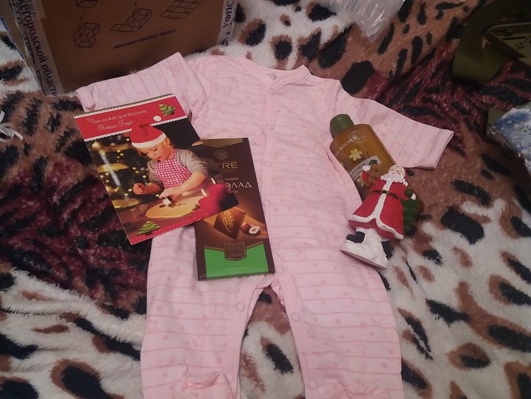 Муж сразу присоединился к потрошению коробки. Сказал, что если что, гель для душа он может взять себе, понравился запах) Ну мы же не жадные, будем делиться, как и шоколадкой. Санта радует глаз, и костюмчик прекрасно дополнит уже немаленькую кучку для дитёныша)