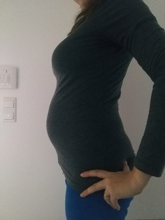 В одежде живот выглядит как-то аккуратнее))) Малышка толкается уже под самыми ребрами. Иногда так "танцует" что телефон из рук выбивает, когда я лежу!