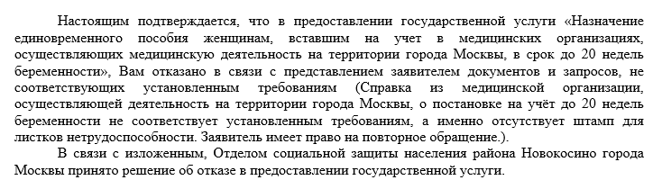Итак, вместе с больничным по БиР мне дали справку о постановке на учёт до 20 недели. На справке стояли прямоугольная печать мед. учреждения, треугольная для справок и печати врачей. На mos.ru подала заявку на выплату, приложила скан, саму справку отнесла в МФЦ - почему-то там по номеру заявки ничего не нашли, но справку взяли, и я попросила мне дать копию со штампом, что справка принята (это без проблем). Пришёл отказ: