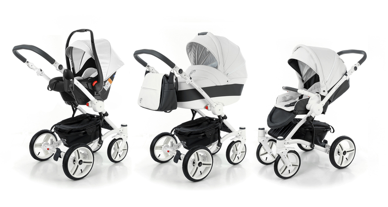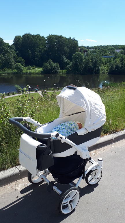 Коляска довольно-таки легкая, хорошо управляемая, вездеходная (племянница всю зиму по лесу в ней каталась, а я сейчас сына в лес на ней вывожу - ну снег, ни корни, ни прочие неровности на пути нам не помеха), легко моется. Ее минус только в цвете - белая эко-кожа на солнце пожелтела. Если не сравнивать с частями, которые не были на солнце, то этого не заметно.