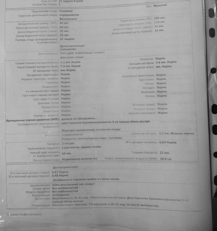 Всем привет, девочки) сегодня была на втором скрининге и результаты как бы не очень....врач узи ставит гипоплазию носа (отношение тпт/дкн 0,89) что выше нормы. Плюсом ставят брахимезофалангию 5 пальца обоих кистей рук. (Но у мужа тоже немного укороченны мизинцы, так что это может быть просто наследственно) Оба маркёра косвенно указывают на синдром дауна . Все остальные показатели в норме , результаты первого скрининга (кровь и узи) в норме. Сходила к генетику, генетик сказала что при хороших результатах крови и др показателей не видит смысла в проколе и амниоцинтозе, так как думает, что все таки в норме . Моя врач сказала переделать УЗИ ещё в другом месте . Хотелось бы услышать отзывы девочек , у кого так было и что в итоге .