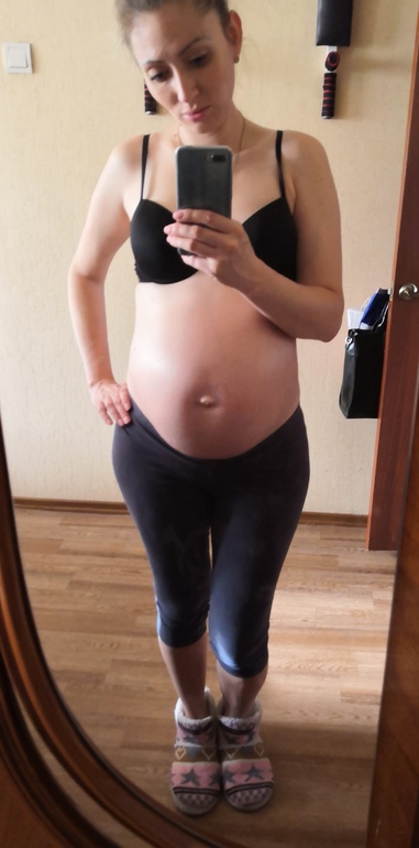 Вот такой гигантский пуз на этот раз. Вес (о ужас!) 62 кг. Прибавка +7 кг. С Марьяшей я практически в таком весе и с таким животом рожать пошла. Кожа натянута до предела, мне кажется ещё чуть-чуть и расползется как арбуз. В крема особо не верю, от физиологии не уйдешь. Смазываю маслом изредка, когда чесаться живот начинает. Ещё фото во всех ракурсах:
