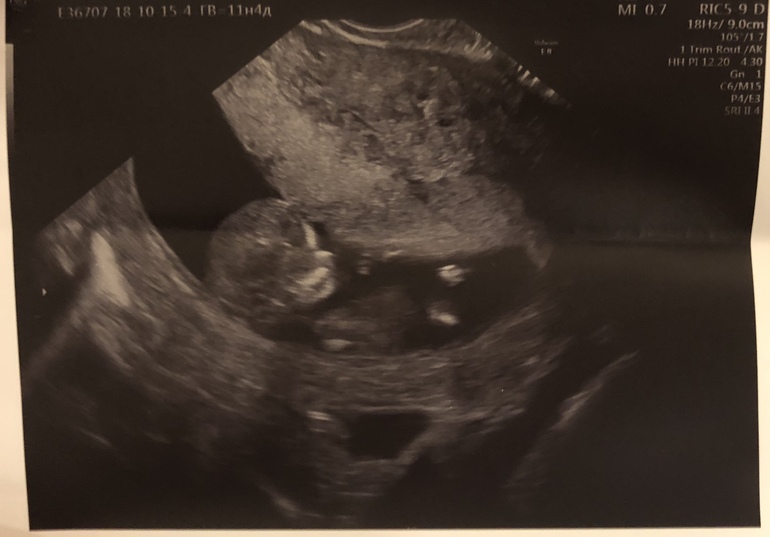 Стоял рядом, за руку меня не держал, романтичной атмосферы не получилось, в общем) Включила она большой экран напротив нас, показала: «Вот голова и профиль, нос, верхняя и нижняя челюсти. Вот ручки согнуты к лицу. Вот сердце пульсирует в грудной клетке. Вот правая нога, а вон левая, видите? Обе согнуты. По УЗИ всё хорошо». Я почти прослезилась от умиления... Муж поугукал и вышел.
