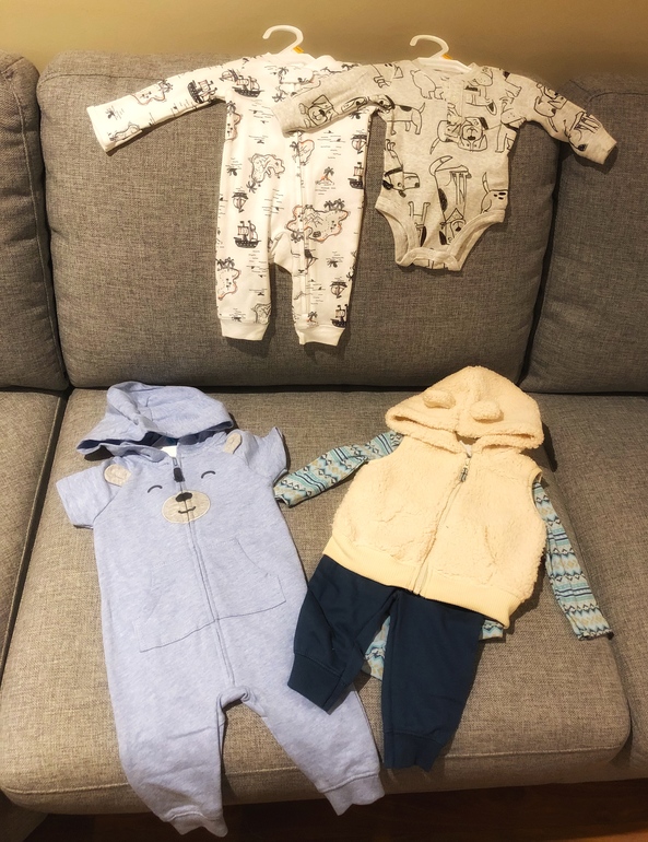 Для вомбатенка тоже сделала первые собственные покупки. Вообще из одежды ребёнку на первое время ничего не нужно будет - так как на нас свалилось неожиданно очень хорошее приданое (о нем я писала недели две назад). Но очень уж руки чесались купить что-нибудь самой, «для души». Вот мои первые покупки - наверху для новорождённого, внизу для 6 месяцев.