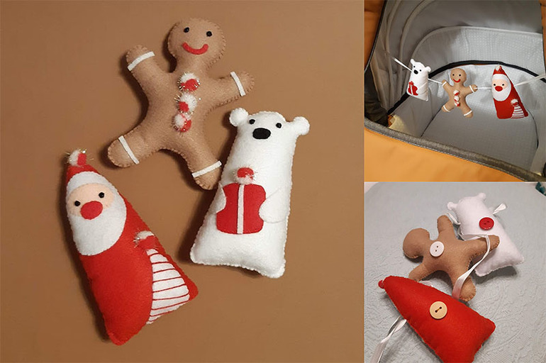 Для ребенка это контрастные объекты, на которых можно учиться фокусировать взгляд. Вот они нужны, и там не особо важно, это будут фетровые сшитые вручную игрушки или вырезанные из бумаги кружочки, например. А для меня это уже новогоднее настроение и творчество, так что игрушка получается как бы на двоих.