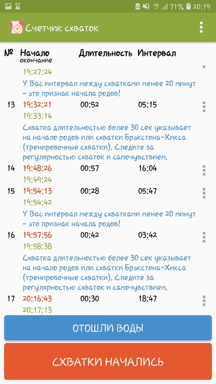 С 11.30 примерно с интервалом 30-25минут, потом 15-17, а теперь станные периоды пошли (от длинных до коротких). Очень смущает сумбур по времени в последних схватках. Терпеть и это треники, или уже готовиться выезжать. До роддома минут 15!