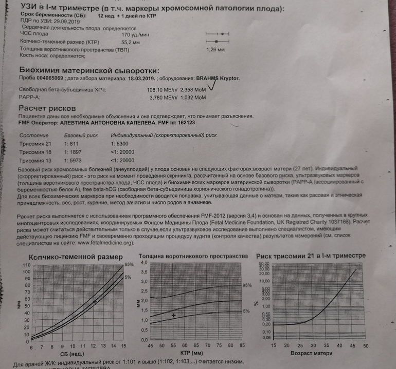 Пугает Трисомия 21, базовый риск - 1:811, индивидуальный 1:5300