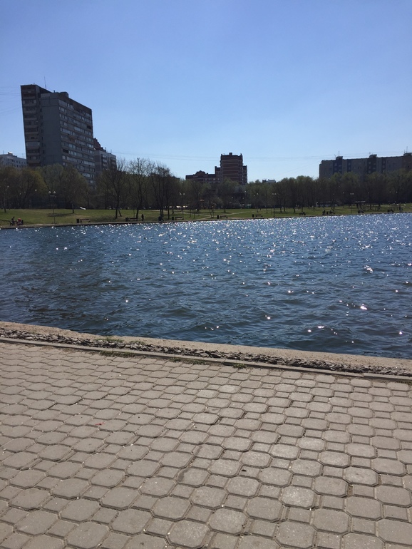 Погода в Москве просто летняя, на солнце очень жарко Это пруд недалёко от дома
