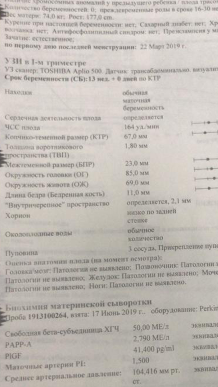 Серьезно, у меня в скрининге (12+5), указаны КТР, ТВП, расположение хориона, воды. Ну и что патологий нет. Врач сказал все хорошо и показал детку. Я не парюсь мы НИПТ делали, но все равно как то прям слишком сжато.