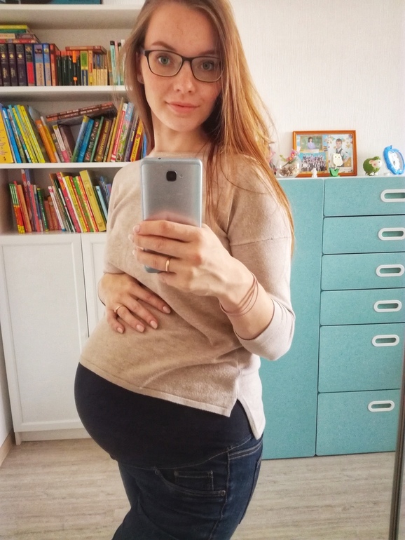 Живот у меня уже поднялся довольно высоко, стоит мне чуть наклонить плечи и грудь уже лежит на животе. Из-за этого желудок мой страдает...А ещё в городе похолодало и я перешла на кроссовки...Теперь о них думаю с мучением, шнуровать дело тяжкое)) Да и большая часть одежды стала мала, даже мои свободные блузки предательски задираются на животе.