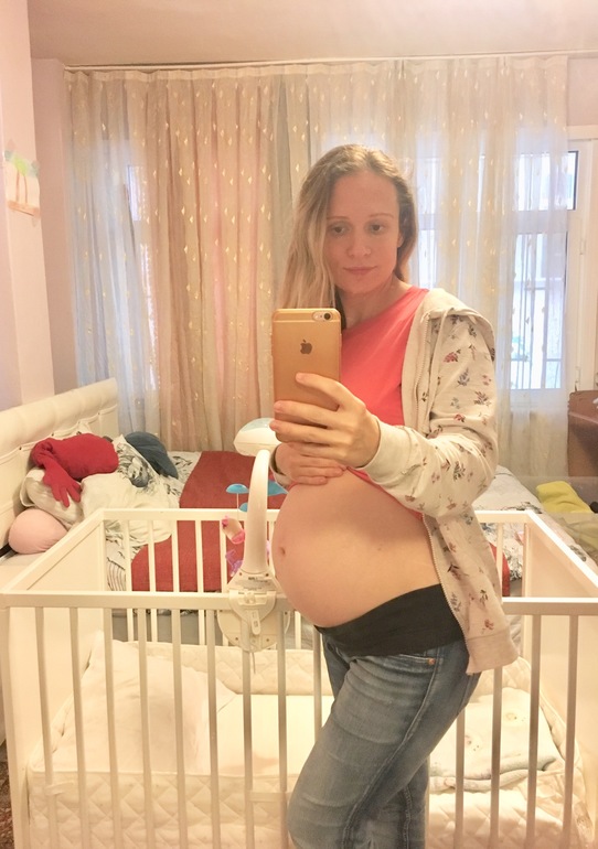 Лежит странно😆: ноги внизу (бьет мне там шейку постоянно), голова около моего пупка справа...