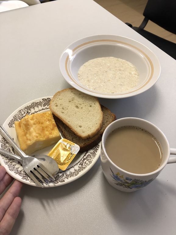 Принесли завтрак. Но меня позвали на КТГи я успела только немного попробовать. когда я пришла, завтрак забрали (соседки по палате уже не было- ее забрали на кс , и некому было сказать, чтоб не забирали еду). Омлет очень приличный, каша приторно сладкая (но это мне так: я не ем каши с сахаром, чай и кофе тоже пью без сахара), какао очень понравилось (вот оно совсем не сладкое!)
