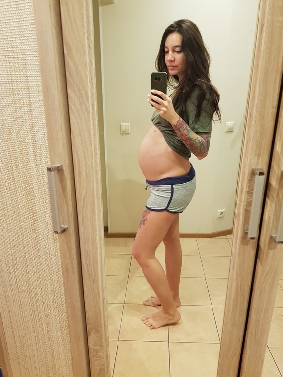 Хотя стало потяжелее. Пузо растёт, промежность болит, иногда тазовые болят кости, от дочери прилетает по рёбрам. Тренировочные бывают, но не часто, особо на них внимания и не обращаю.