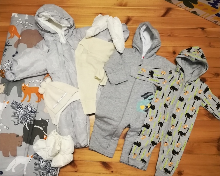 На зиму и холода комбез, который делается мешком, синтепоновый конверт, полушерстяная поддева, комбез на лёгком синтепоне и ещё один из плотного хлопка, краги, тапочки, шапка. Все 68-74, Рейма. В прошлый раз нам размеры как раз были идеальны на зиму, в этот раз явно будет велико. Может на осень пойдет.