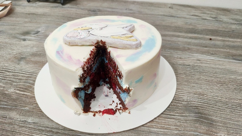 Так как я терпеливая в этом вопросе, то решили перед новым годом с близкими сделать минипраздник с разрезанием торта, по начинке которого станет ясно кто же там. Врач написала на бумажке пол, кондитер испёк торт.