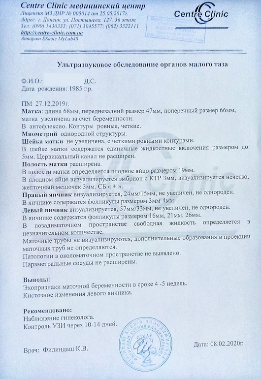 Первое УЗИ, срок по М 6+1. Ре считает ровно 5 недель, так как цикл длинный. Плодное яйцо большое уже. В левом яичнике 2 ЖТ, просто не захотели подсвечивать.