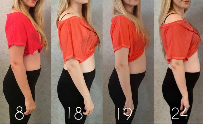 Но, с другой стороны, там и фоткать было особо нечего за эти 4 недели, прогресс был не особо заметен) Зато разница между 19 и 24 видна уже неплохо) Прибавка - ровно 3 кг от добеременного веса)