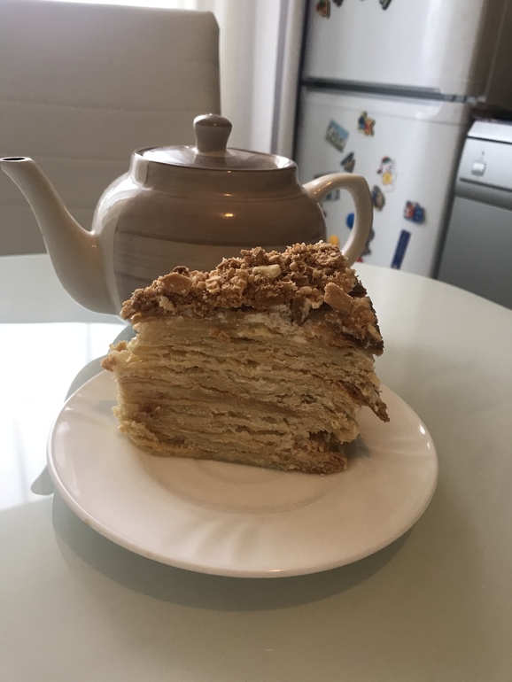 Два дня назад испекли торт Наполеон, в основном готовили муж и Алина, я только немного крем помогла сделать