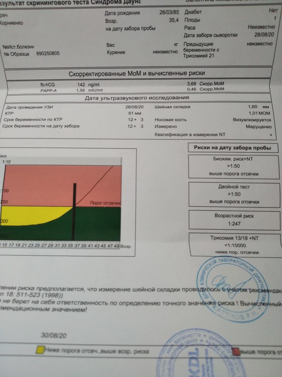 Сдала на всякий случай скрининг 2 триместра. Для примера видно как меняется риск при адекватно заполненных данных, которыми все-таки не следует пренебрегать.