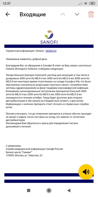 У меня остался Клексан 8 шт , после удачного протокола , пишите , если что отправлю транспортной компанией 😊