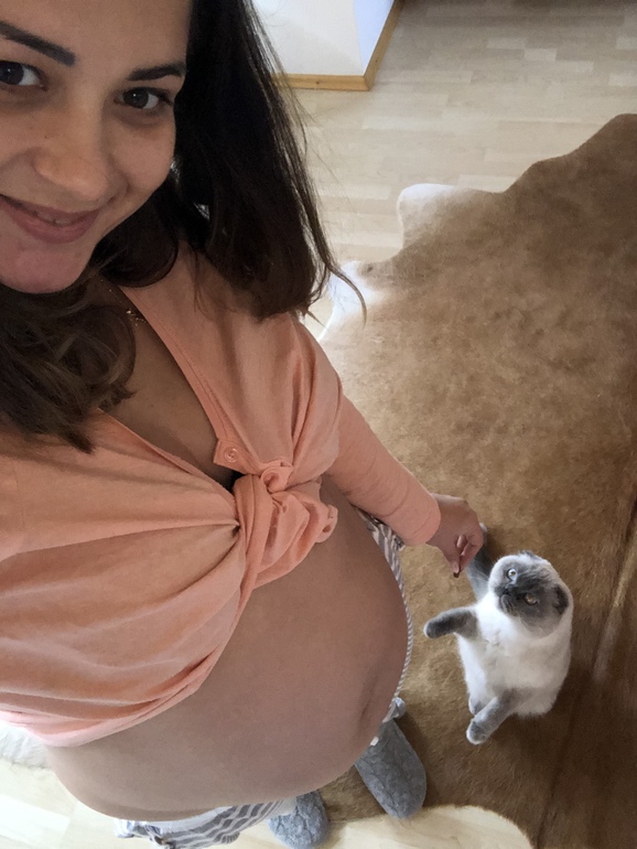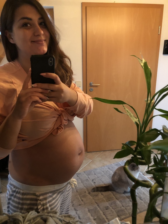 А животик такой аккуратный, маленький, и не скажешь что совсем скоро долгожданная встреча с малышом.. как быстро время летит:) Сколько уже малыш весит? С именем определились?