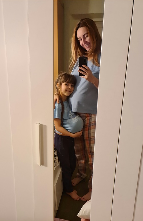 Крошка моя активистка,такие волны устраивает!😁И пинает под ребра очень чувствительно прям))Уже заметила,что примерно в среду, как скачки роста у неё)Чувствую,как она становится больше)🥰Почти все время активность под рёбрами справа(уже все отмассировала😅),и перекаты в районе пупка))Ну и конечно икота...Старшая очень любит наблюдать, как младшая волну запускает))😁Интересно малышка тоже будет моя моя прям,и маленький хвостик,как старшая сестра)Не могла не запечатлеть))😅