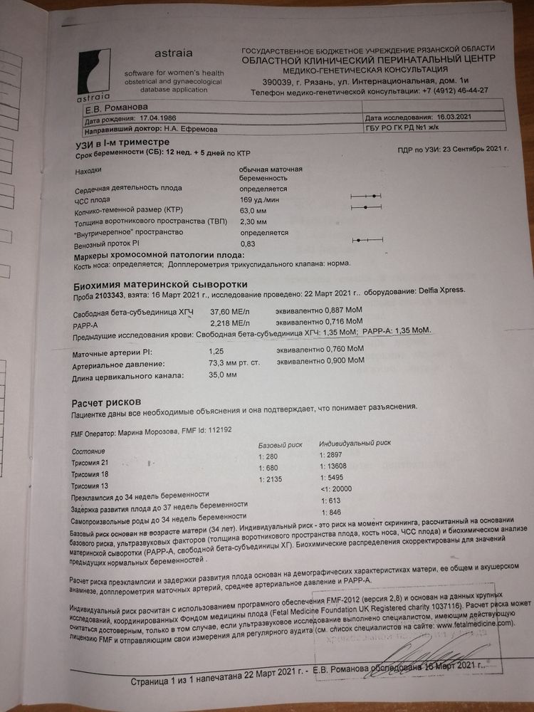 Катерина Романова, какой тут возраст? 🤭 Мне 34 года и возрастной риск 1:3** (не помню, триста с чем-то). Врач сказал даже не смотреть на него 😅 Типа неинформативный вообще. Надо именно на хромосомные только смотреть))))