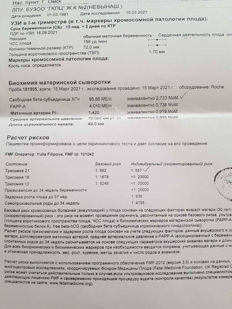 В итоге записалась платно к генетику на 27 апр, а 26 у меня уже 2 скрининг. Меня смущает, что хгч повышен, а риск СД ( 21 трис) не такой уж и маленький.