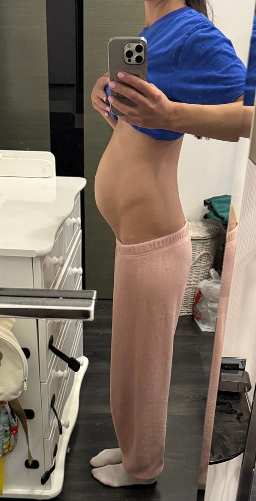Во вторую бер меня на работе спалили на 8 неделе. Сейчас в 6 уже было заметно. Я прекрасно понимаю, что это гормональное вздутие, там человеки 1,5 см на этом сроке. Но вот так) Сейчас у меня визуально 4й месяц точно 🤣 и видно, что это не пельмени