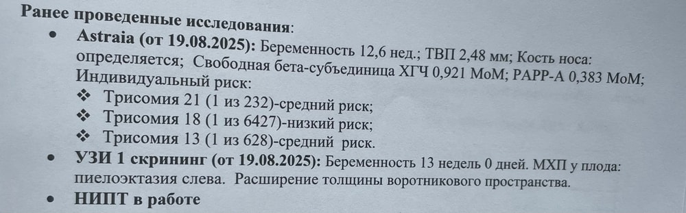 Анализы, скринингиДорогие девочки, по результатам скрининга трисомия 21 риск ( 1 из 232) средний риск, трисомия 18 (1 из 6427) низкий риск, трисомия 13 ( 1 из 628) средний риск. По результатам НИПТ риски низкие, но мой гинеколог советует амниоцентез сделать только из-за твп 2,48. Вы бы стали делать? У меня сомнения…