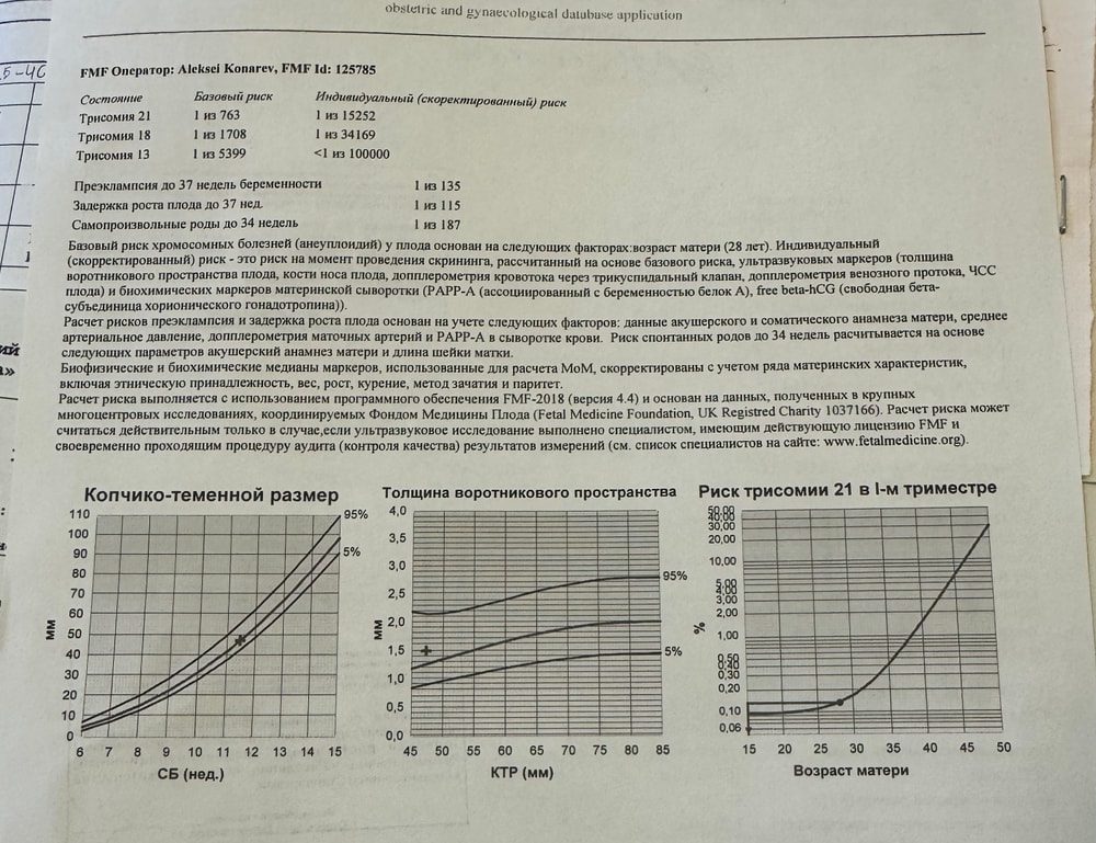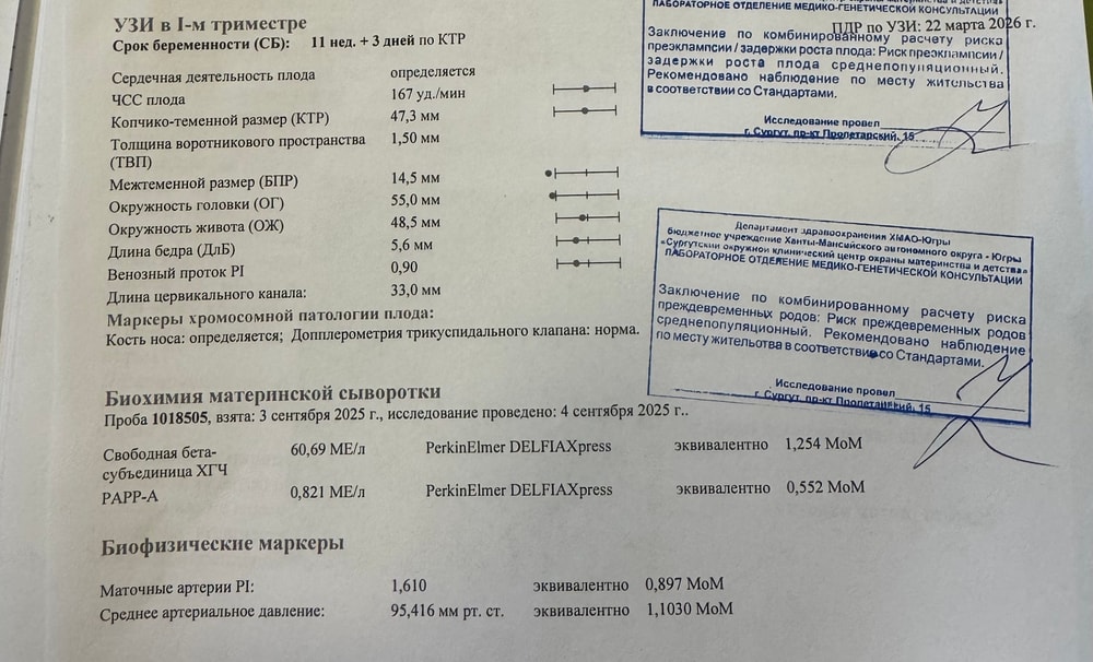 Была на консультации у генетика, по 1 скринингу и крови все хорошо и риски низкие. (прилагаю фото)