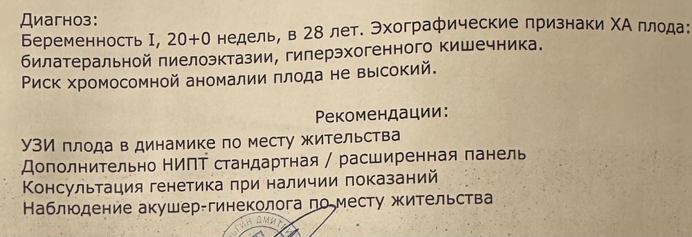 Генетик пересчитал риски, сказал, что они так и остаются не высокими. Что 1, что 2 скрининг хорошие показатели анатомии малыша (в 3D смотрели тоже). Про кишечник вообще толком ничего не сказал, мол «это не патология, просто особенность развития в данный момент, чаще всего исчезает к 3 скринингу». По поводу расширенных лоханок (расширены до нормы (во 2 триместре норма до 4)) сказал просто наблюдать. Показаний к проколу он не видит, потому что, цитирую, «для него должны быть весомые показания, по каждой мелочи его не делают». Я так поняла, что страшного ничего он не увидел, потому что лечения никакого не назначил, просто сказал повторить узи через 1,5-2 месяца, чтобы посмотреть не расширены ли больше лоханки стали. Опять же, про кишечник ни слова, будто его это вообще не беспокоит никак (если бы было всё плохо, он бы назначил мне прокол или узи хотя бы раньше, да? Или я пытаюсь себя успокоить?). Сказал, что могу сдать НИПТ для своего успокоения, но он платный, мол (бесплатно только по показаниям).
