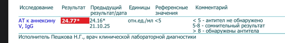 Калина красная, аннексин рекомендовал проверить первый гематолог (обратилась к ней после перенесенного ковида). Она сказала, что остальные АТ нет смысла проверять, т.к. это не повлияет на тактику лечения. Меня это насторожило. Записалась к новому гематологу и по его назначению сегодня сдала антитела к бета-гликопротеину, кардиолипину, волчаночный антикоагулянт, антинуклеарный фактор и антитела к двуспиральной ДНК.