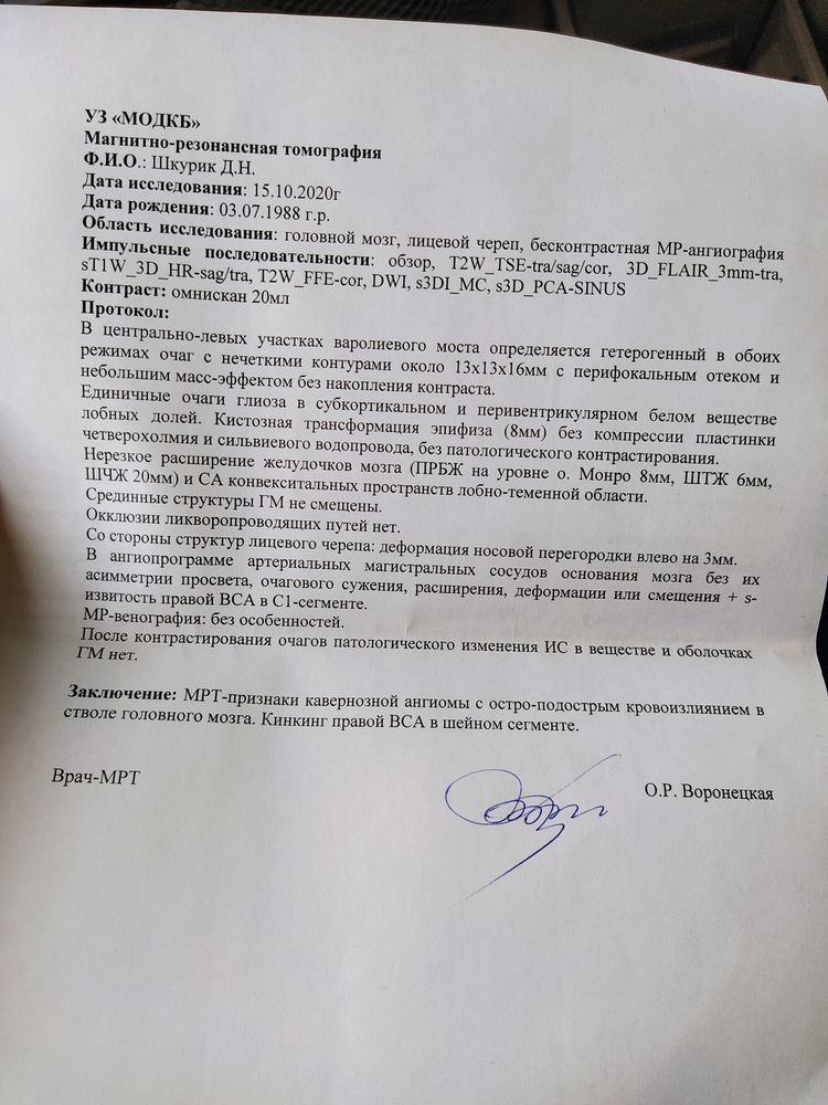 НеврологияПредыстория: мужу стало плохо потерял речь и немного онемели ноги. Забрали на скорой, было сделано КТ и врачи не исключали опухоль. Сделали МРТ с контрастом, опухоль исключили, ниже заключение. Но врач сказала ходите под Боженькой. Речь восстановилась на 90%. Ухудшается при волнении и усталости. Сейчас ищем хорошего нейрохирурга. Подскажите, может кто знает из практики. Речь восстановится полностью? Или теперь всегда при волнении будет ухудшаться?