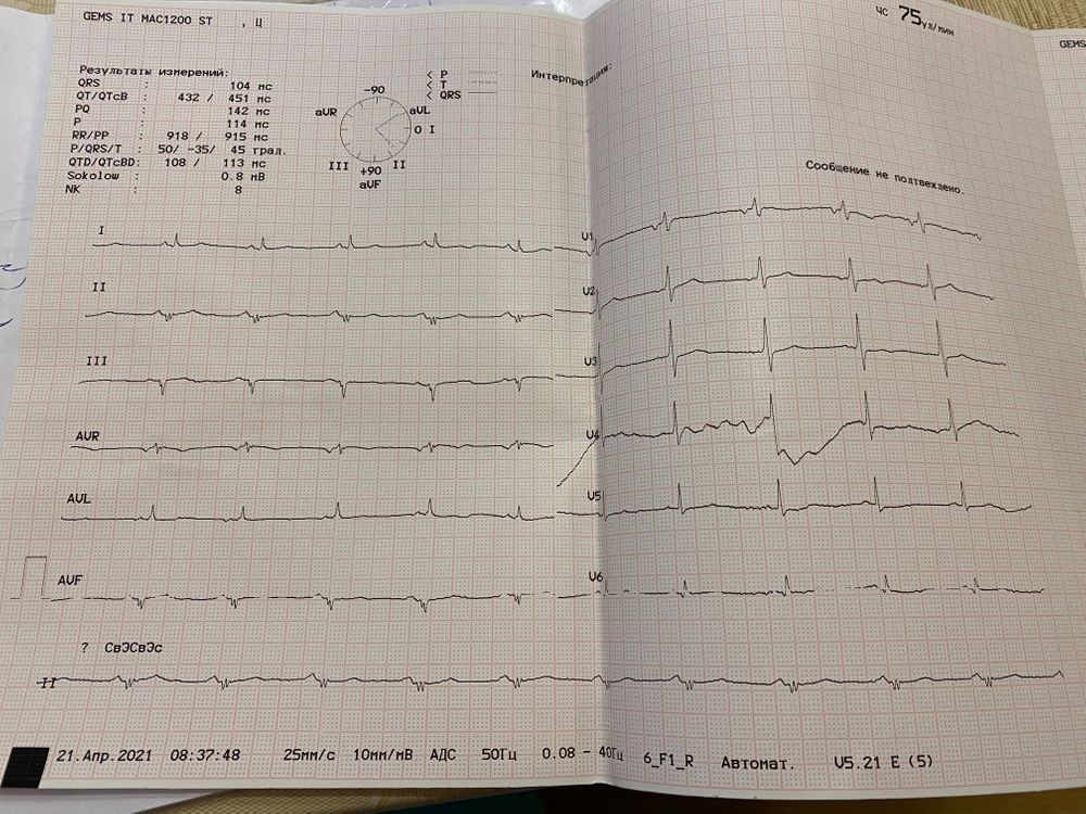 Синусовый ритм, ЧСС 75 сокращений в минуту, электрическая ось влево, рубцовые изменения нижней стенки. Блокада передней ветви левой ножки пучка Гиса. И рекомендация переснять. В 4 грудном отведении электрод слетел.