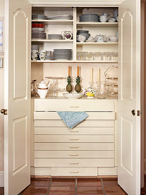 Теперь, когда вы избавились от всего лишнего, нужно подумать, где и как хранить посуду так, чтобы она вам и не мешала, и одновременно была всегда под руками. Сервиз, который предназначен для приема гостей или семейных праздников, желательно хранить не на кухне. Для него может быть установлена горка или специальный шкаф в одной из комнат. Почему лучше хранить «парадную» посуду вдали от кухни? Потому что в комнате в отдельном шкафу она будет оставаться кристально чистой: пришли гости - а посуда у вас вся блестит! На кухне трудно сохранить все предметы в идеальном состоянии: из-за копоти, испарений на посуде образуется налет.