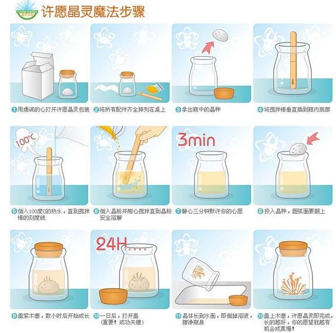 В комплект входит посуда для выращивания, порошок, основа, палочка, бирка с веревкой (как я поняла, для пожеланий, кристаллы то магические), прикладывается инструкция в картинках, так что знать китайский не надо :)