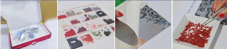 Напоминаю, что набор в алмазной технике представляет собой основу с нанесенной клеевой основой и схемой, пакетики с так называемыми алмазиками - ограненными квадратиками разных цветов, а также вспомогательные материалы - пинцет, белый карандаш для выравнивания, формочка.