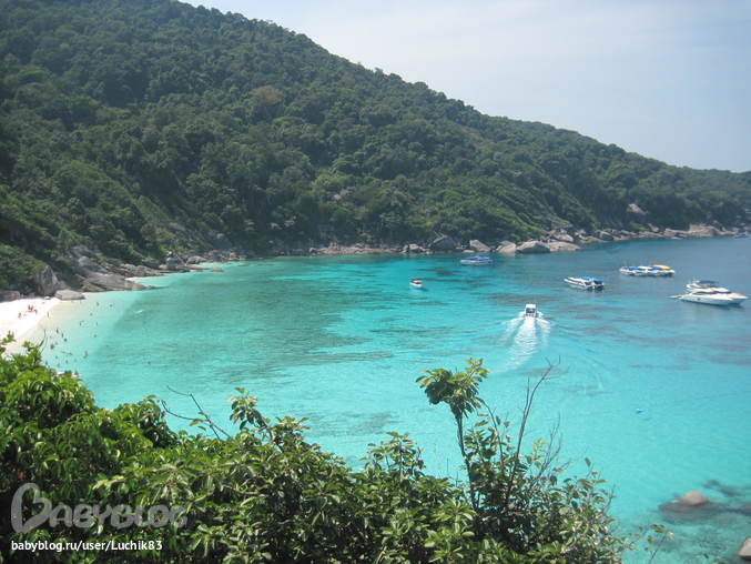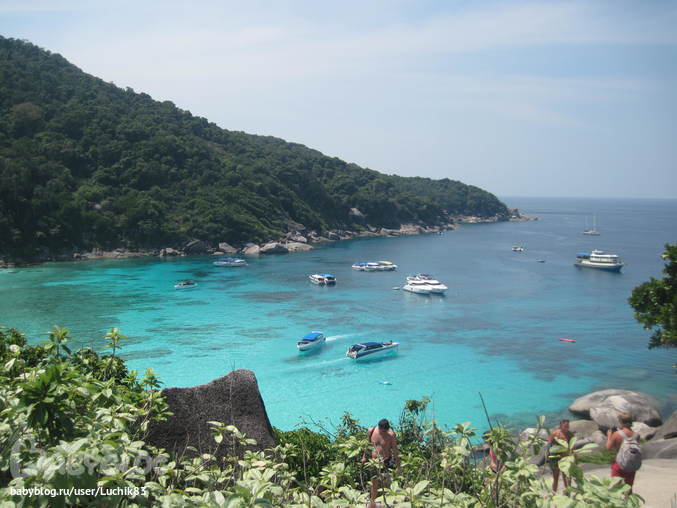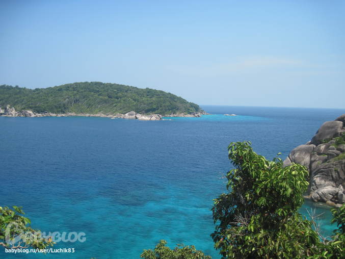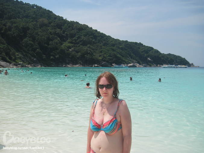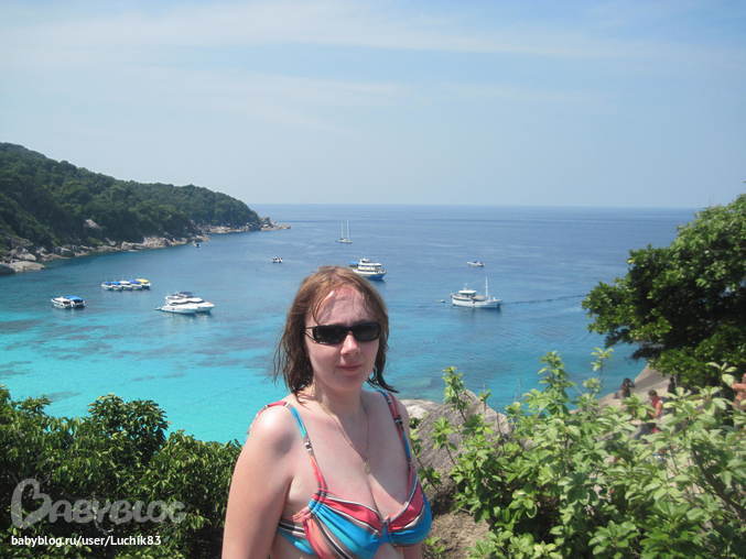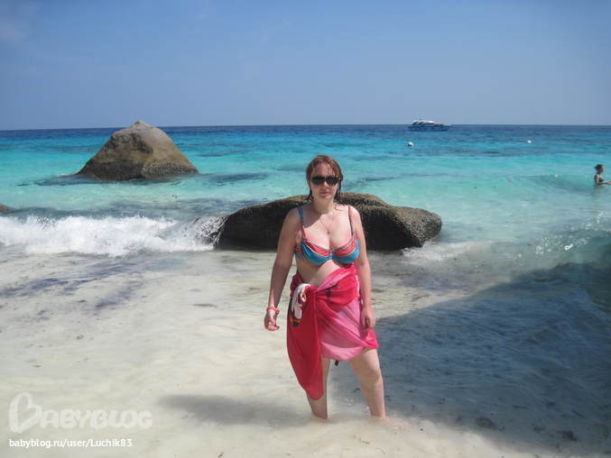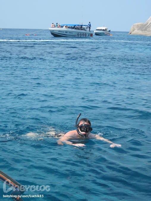 Про экскурсии. Взяли мы все-таки у туроператора, хотя нам знакомые советовали брать на улице, там везде полно точек стоит. Но я как-то зная плохо английский, имея не такую большую сумму денег на отдых, решила - нафик, лучше переплачу 1300, чем буду огорчена, если меня кинут. Экскурсию взяли на Симиланские острова, на один день правда. Наверное, надо было все-таки на пару, т. к. дорога была утомительной. 1,5 часа ехали от отеля до пристани, потом еще 1.15 на катерескоростном. Вот это конечно экстрим, мы еще сиделе на носу, нас так качало, порою думала, что вот-вот выпрыгнем из него. Перед погрузкой нас на катер попросили сдать всю нашу обувь в контейнеры. Зачем - не понятно. Наверное, чтобы не нарушать микрофлору заповедника и не наносить грязь? Потом я об этом очень пожалела. Мы посетили 4 острова. На первом плвали с масками. Тут отдельная история. Я ни разу не ныряла. Вот так сложилось. Я и плавать то плохо умею. Вообще дали мне маску с трубкой и на всяк пожарный бронежилет, тьфу, спасательный жилет. Ну и начала я пытаться на поверхности заглядывать что-там под водой.Причем с этим жилетом я была как поплавок - ни туда, ни сюда плыть не могла. В маске было жутко не удобно с непривычки, я ее переодически снимала, муж чертыхался, что я так ничего и не увижу. Не, ну что-то я увидела, рыбки красивые, кораллы. Но главное меня ждало впереди. Нам сказали, что там есть возможность поплавать с черепашками. Повторяюсь, с черепашками. Поныряв, или что-то сделав подобное, я приказала мужу пришвартовывать меня к катеру, он меня послушно повез, и тут подо мной проплавает нечто..Годзилла или того хуже..Я натыкаюсь на что-то твердое и тут мне орут: Девушка, под вами черепаха!. Ох, что я тогда пережила описать сложно, если писать по простому - чуть не обкакалась! Ну, я же не знала, что морские черепахи такие огромные, слово "черепашки" мне представляло милых маленьких созданий! Вообщем, потом как оказалось, мне жутко подфартило, т. к. некоторые ныряльщики черепах так и не увидели. На втором острове нас покормили и при желании можно было подняться на смотровую площадку, "скалу-парус" и полюбоваться видами. Вот тут то я и вспомнила о своиз шлепках! Сколько мата вырывалось у меня, когда я взбиралась наверх по раскаленным камням!))) Виды, конечно красивые, вода там бесподобная, белы песочек, ну вообщем рай на земле!!! Жалко, только мало времени дают покупаться. На третьем острове - снова ныряли, я уже не пошла, мне хватило первого раза, маужа только немного поснимала. А на четвертом острове просто купались. Решились пройти через джунгли на другой пляжик, там муж до огромного синяка себе палец сбил, без обуви же были. Но какое же там море, это сказка!!!! Обратно было уже пофиг на качку катера, почти половина народу спала, я в том числе вырубилась))