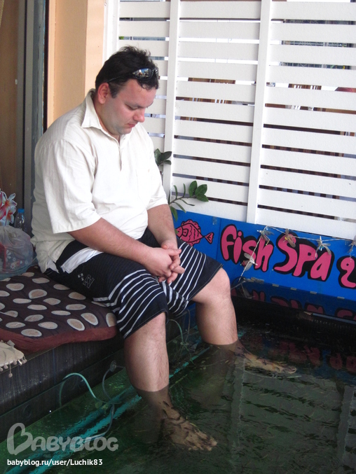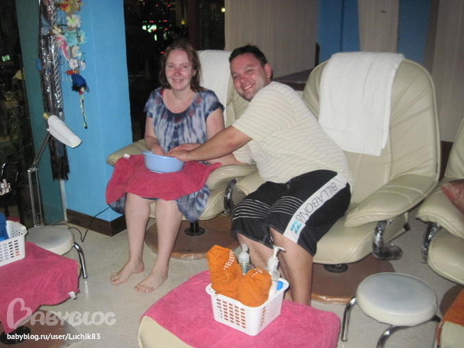 Чем еще занимались? Сделали массаж тайский, это кайф! Муж пару раз, я всего один, т. к. я там жутко обгорела. Для светлокожих солнце, конечно, убийственное там. Я мазалась толстым слоем нивеей 50 и все равно сгорела. Сделала себе еще там педикюр и маникюр по 250 батт стоит. Муж себе педикюр рыбками сделала на Кароне (100 батт 20 минут). Я отказалась от этого сомнительного удовольствия)))