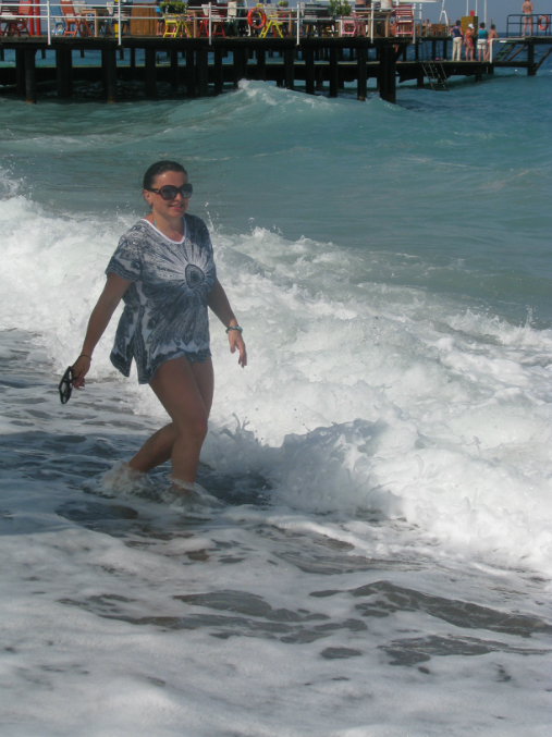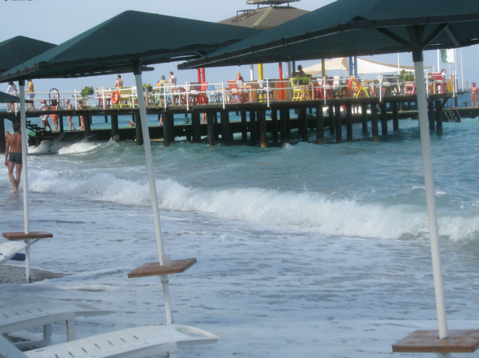 Пляж - галька. В море большие волуны - заходить лучше в спец. обуви, но нас это абсолютно не напрягало - мы все (включая Анюту), купались (прыгали и ныряли, спускались в воду по лесенке) с пирса :)) несколько дней хорошо штормило и однажды ночью даже выбило волнами доски с пирса! А я вдоволь покаталась на волнах :))
