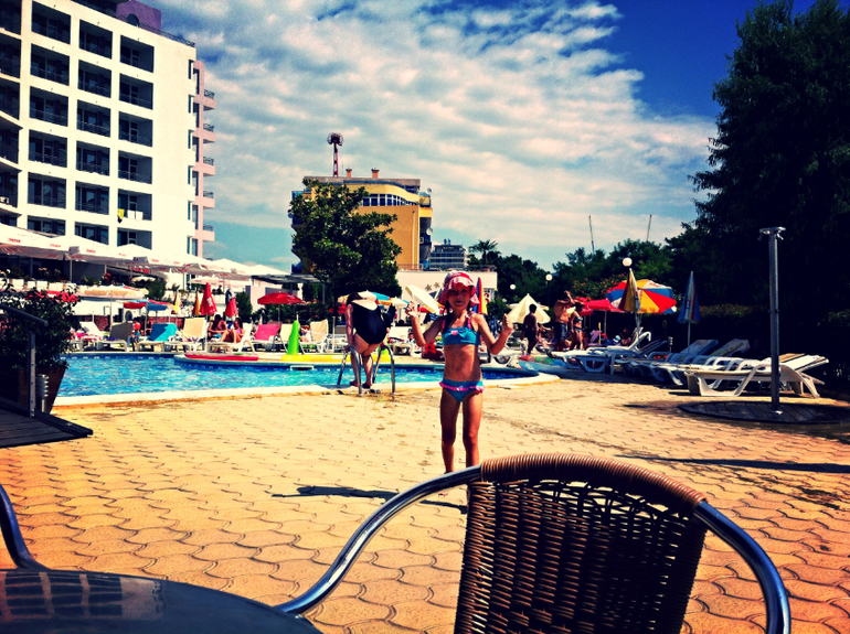 Ну и еще телефонофото нас для истории))Ну и в заключение хочу сказать, что я вряд ли туда вернусь, только если по работе или за компанию с кем-то, мне Болгария не понравилась, люди в палатках-магазинах не особо доброжелательные (в отеле такого не было, там все очень милые), не купила ребенку кеды, потому что они малы, а продавщица уверяет меня, что в самый раз, так они летят в дальний угол...это вообще как? Конечно, так не везде, но очень во многих местах. Соседи по отелю говорили про такое же отношение в кафе-ресторанах (мы там были только два раза, поэтому выводов сделать не можем). Пока стояли очередь на регистрацию разговорились с отдыхающими и почти все были чем-то недовольны, кто отелем, большинство питанием, кто еще чем-то. У нас был не самый плохой отдых, но видимо, я ожидала чего-то бОльшего. К примеру в прошлом году в Адлере мне понравилось на много больше, чем в этом году в Болгарии. Да, если у вас куча денег и вам не жалко оставить их в Болгарии, то возможно, вам и понравится, мне приходилось на всем экономить, т.к.деньги там разлетаются в момент и на всякую ненужную ерунду((
