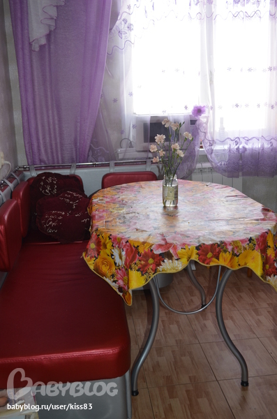 со старой скатерью-цвЯтастой,так что столешницу не видно.Но самая фишка в нем-это ножки фигурные!именно такой нам и надо было,тк садиться за старый стол(с прямыми деревянными ножками)неудобно было-приходилось отодвигать,чтоб просунуть ноги.Так что...смысл на фото понятен.