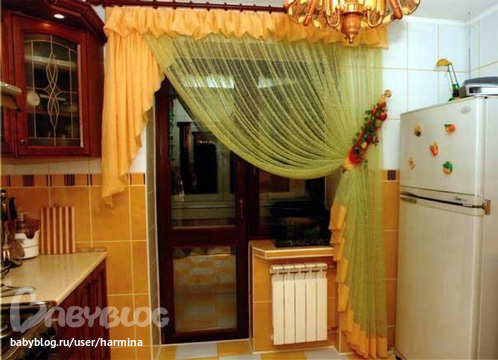 Не могли бы Вы посоветовать мне какие-нибудь варианты оформления окна на кухне (с балконной дверью)? Всю голову сломала. Хочется чего-нибудь уютного, но не слишком навороченного. Мы молодая семья до 30 )) Заранее благодарю!