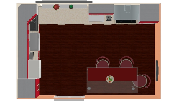 гарнитур вдоль правой стены- во всю стену и на угол, немного схема нанесена, обеденная зона слева. техника встроенная - варочная, духовка, посудомойка, холодильник возможно встроенный.