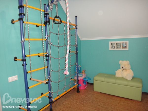 Очень свежо у вас получилось. И цвета обалденные. Мы тоже уже купили спорт уголок. И я очень хочу стены покрасить в бирюзовый цвет, как у вас. А на одной стене обои...Очень свежо смотрится))