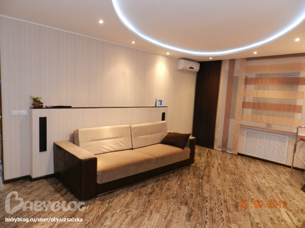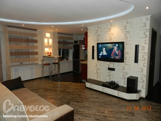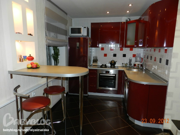 1. Это кухня-гостиная. Пока не увидела эти реальные на мой взгляд фотки, даже не рассматривала такой вариант у себя. А теперь очень нравится. Особенно подкупило то, что на фото план такой же, как и в нашей квартире. Размеры кухни около 6 кв.м. (2,5*2,5), гостиной около 16 кв.м. (3*5,5)