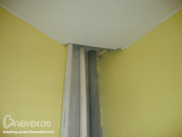 это кухня- натяжной потолок у моей дочки- мастера обошли трубы и вставили туда незаметные металические кольца- за каждое отверстие платили по 200руб- все аккуратно- фото поближе у меня пока нету